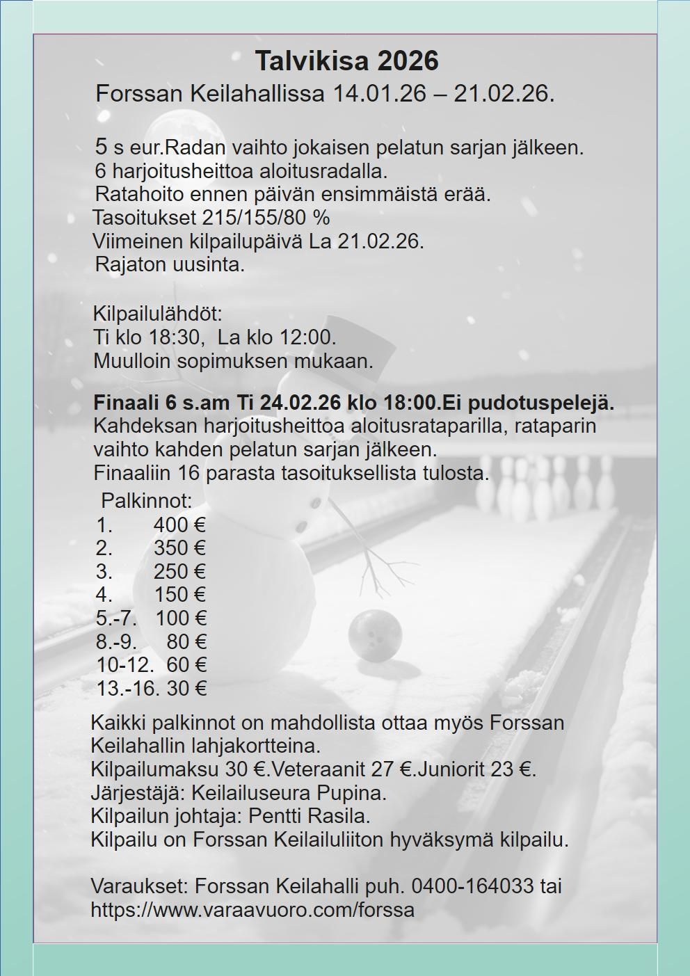 Kilpailuilmoitus Olosuhde Tulokset Finaali 13.1. Klo 18.00 Finalistit: 1. Valaranta Ari 2. Salminen Jesse 3. Valaranta Samu 4. Pulkkinen Immo 5. Salminen Mika 6. Rantanen Jorma 7. Pajunen Sami 8. Lankinen Keijo 9. Poltinoja Jouni 10. Alakarjula Mikko 11. Rasila Pentti 12. Palm Jarno 13. Friberg Pasi 14. Tuominen Elmeri 15. Pieniniemi Mika 16. Tuominen Olli-Pekka